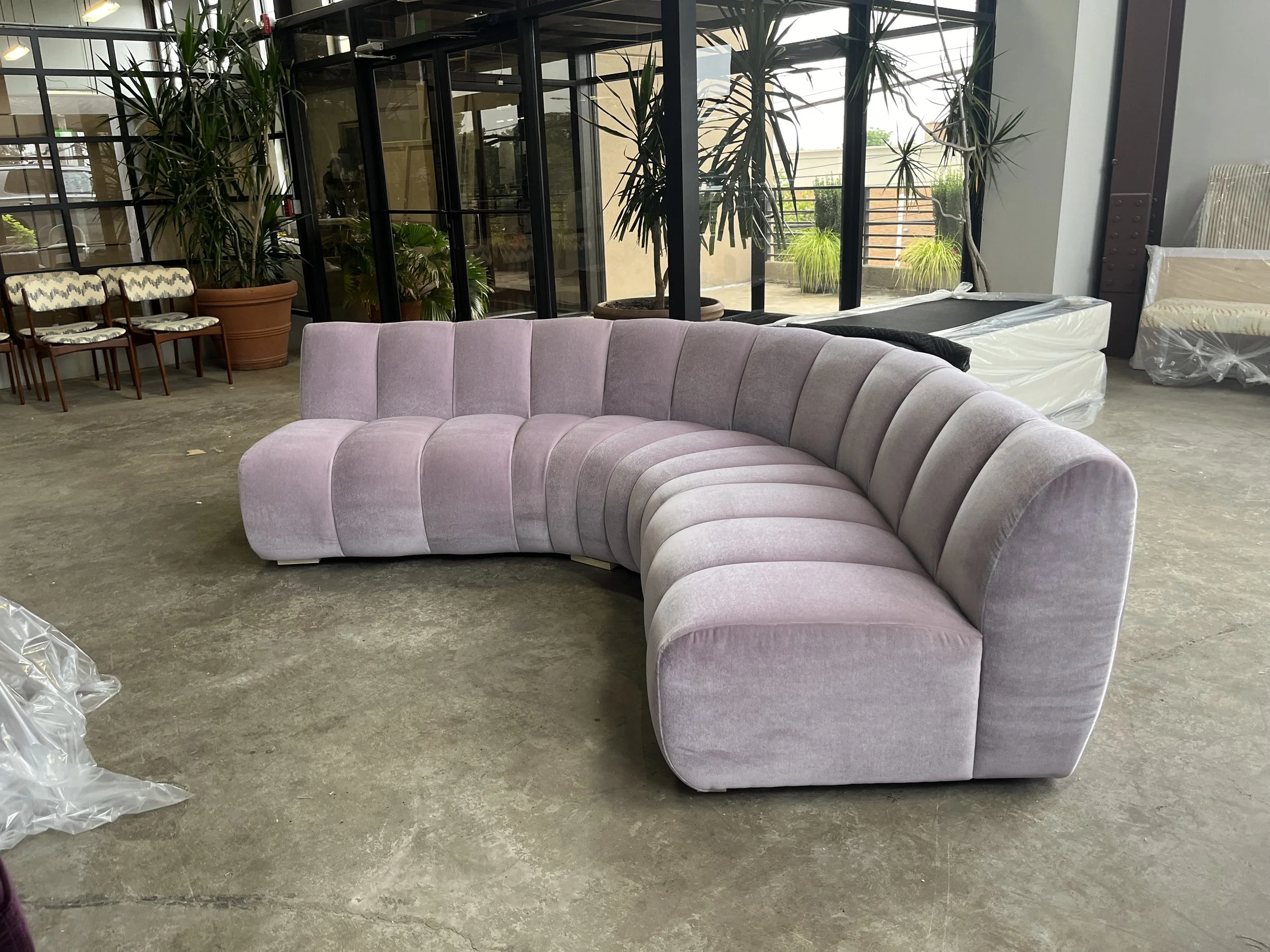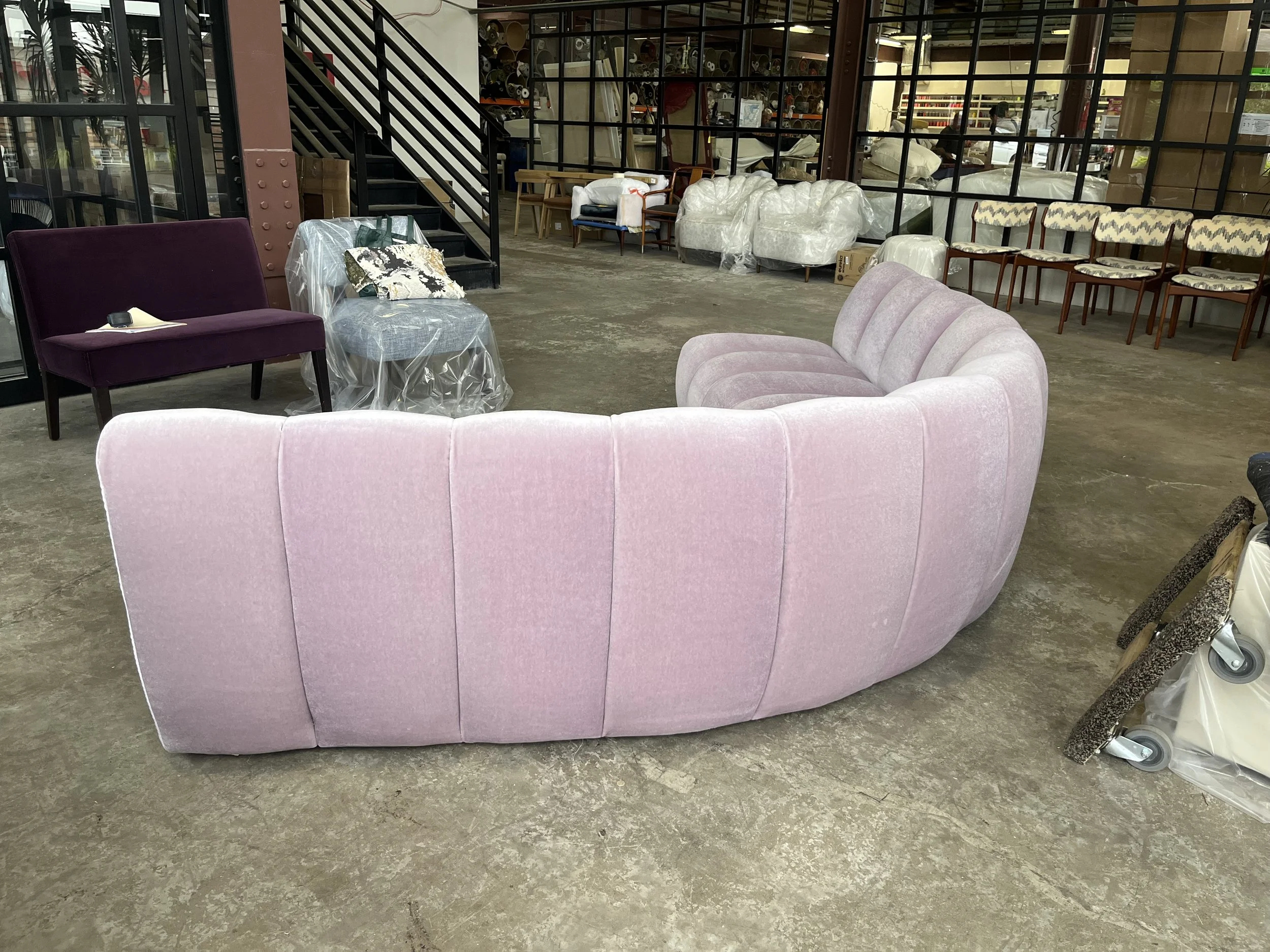 Custom banquet height channel tufted sofa - The client wanted somewhere to lounge in the game room, that could also have a table pulled up for a board game.